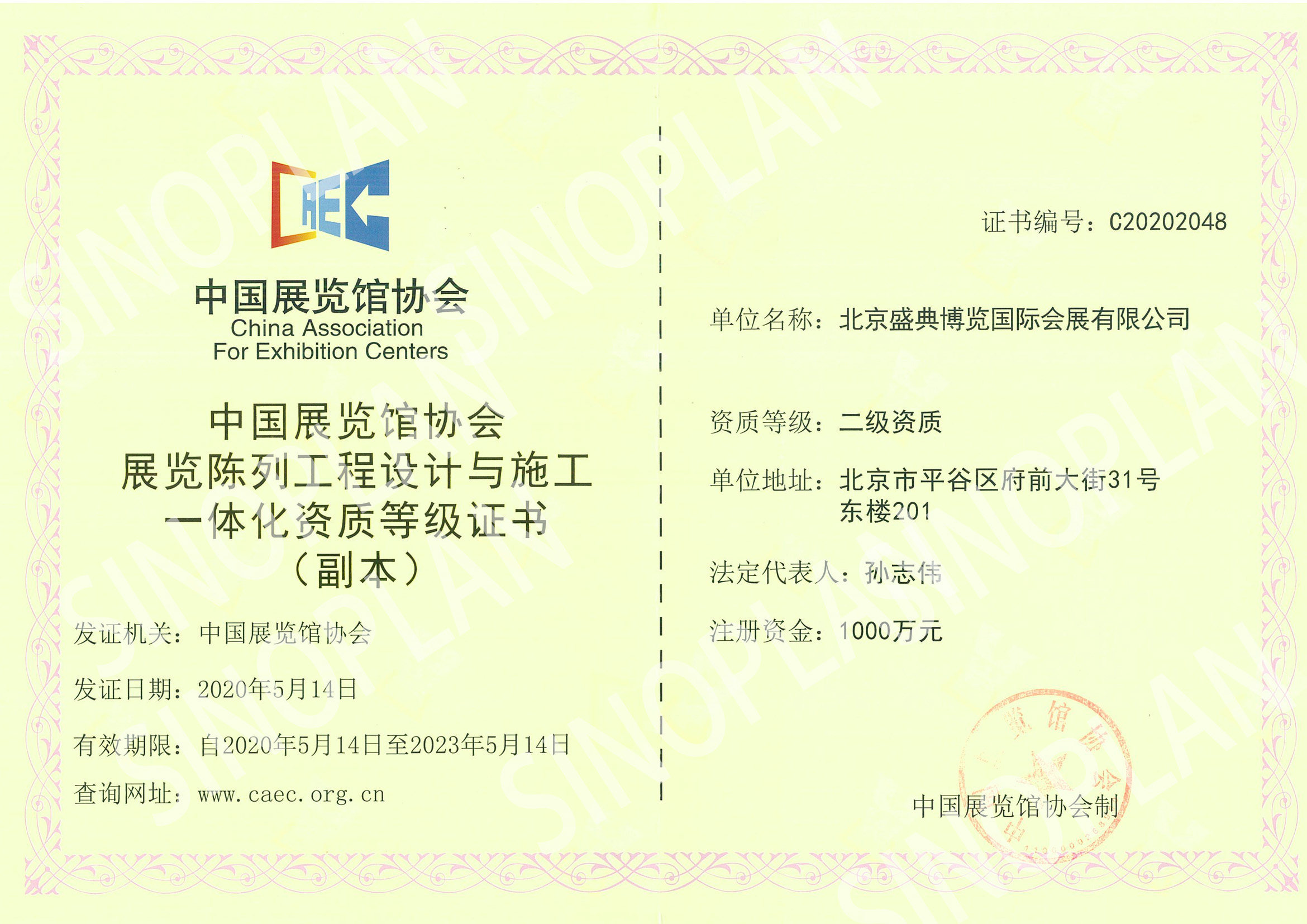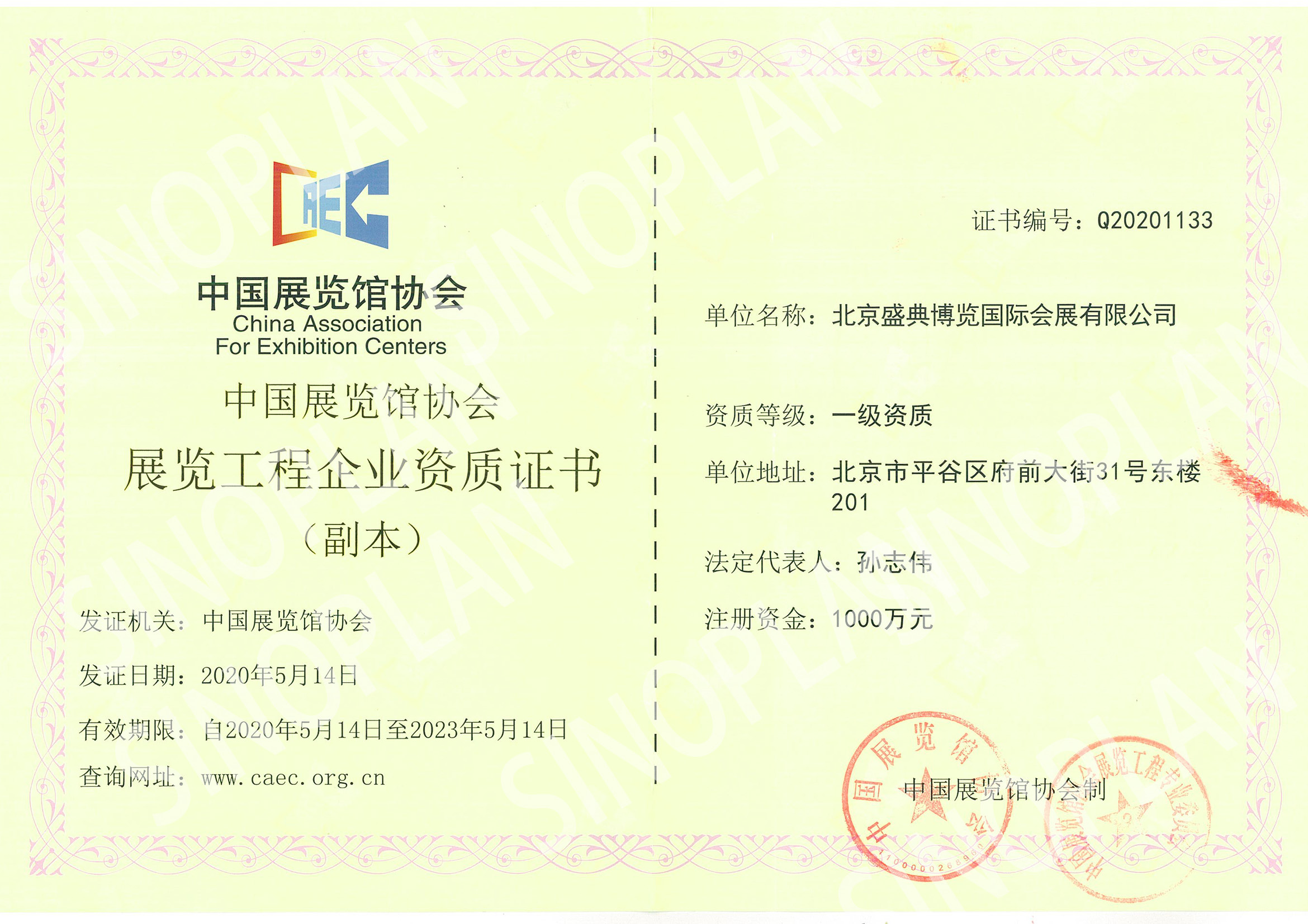 北京盛典博覽國際會展有限公司,注冊資本1000萬元,是中國國際展覽中心指定的主場運營設計施工單位之一,是中國展覽設計施工一級資質單位之一,建設部頒發建筑裝飾二級資質,北京市會展定點采購單位,通過了ISO9001質量管理體系認證和ISO14001環境管理體系認證。公司是集展會策劃、策展、主場運營、搭建、特裝設計、展廳規劃館、博物館空間設計和實施為一體的“一站式”專業會展服務的會展公司。