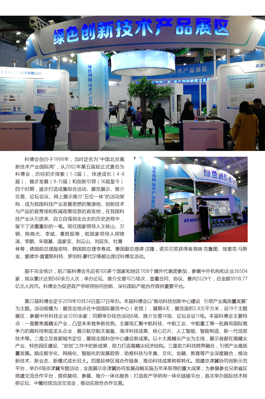 為落實綠色發展和生態文明建設有關要求,推廣節能技術產品,促進節能環保產業發展,北京節能環保中心在第22屆中國北京國際科技產業博覽會設立綠色創新技術產品展區,集中展示符合北京市產業結構發展方向的節能低碳領域先進成熟技術產品,取得圓滿成功。