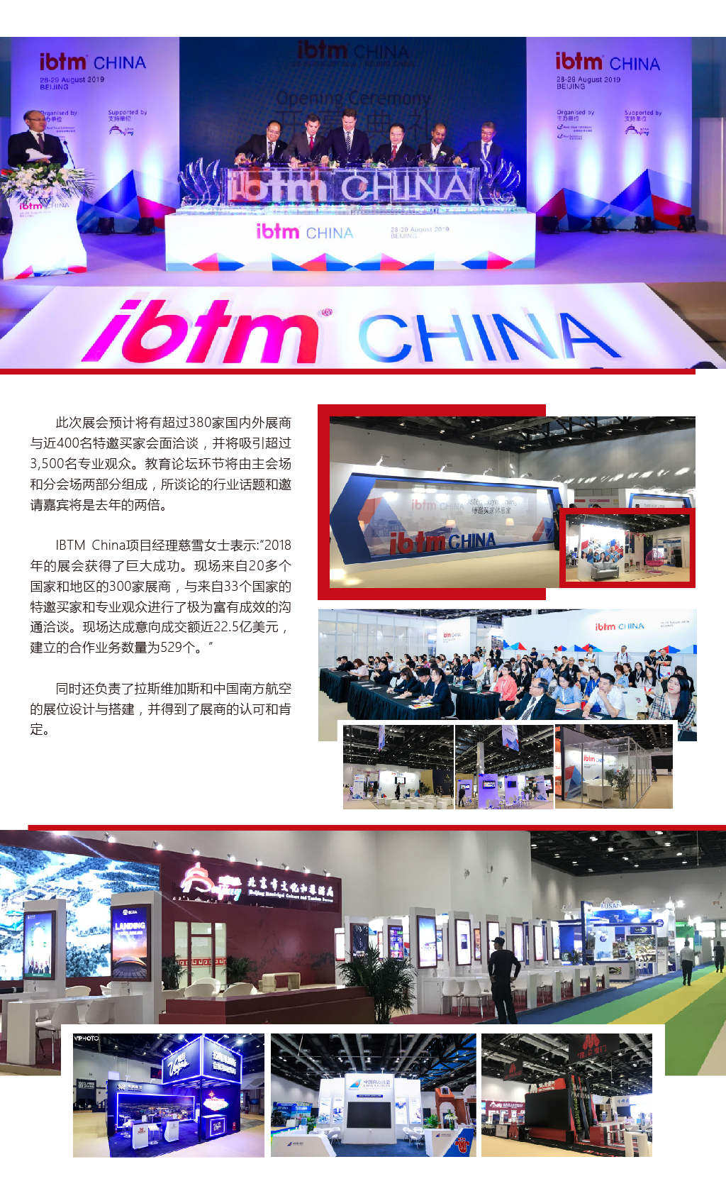 IBTM China作為勵(lì)展旅游展覽集團(tuán)旗下ibtm®系列展覽的中國站 -- 首次披露其2019年展會(huì)具體信息。主辦方明年將增大國內(nèi)二三線城市和亞太區(qū)域內(nèi)特邀買家的邀請(qǐng)比例。引進(jìn)“Happy Hour”環(huán)節(jié)并增設(shè)“互動(dòng)體驗(yàn)區(qū)”,增強(qiáng)展商和特邀買家的現(xiàn)場多維互動(dòng),力圖通過創(chuàng)造一系列全新社交活動(dòng)以促進(jìn)展商和買家建立有效的商務(wù)合作。盛典公司為本次展會(huì)提供了主場運(yùn)營及主場搭建服務(wù),同時(shí)負(fù)責(zé)拉斯維加斯會(huì)展和觀光局、海南航空展臺(tái)的搭建,獲得了展商及主辦方的認(rèn)可。